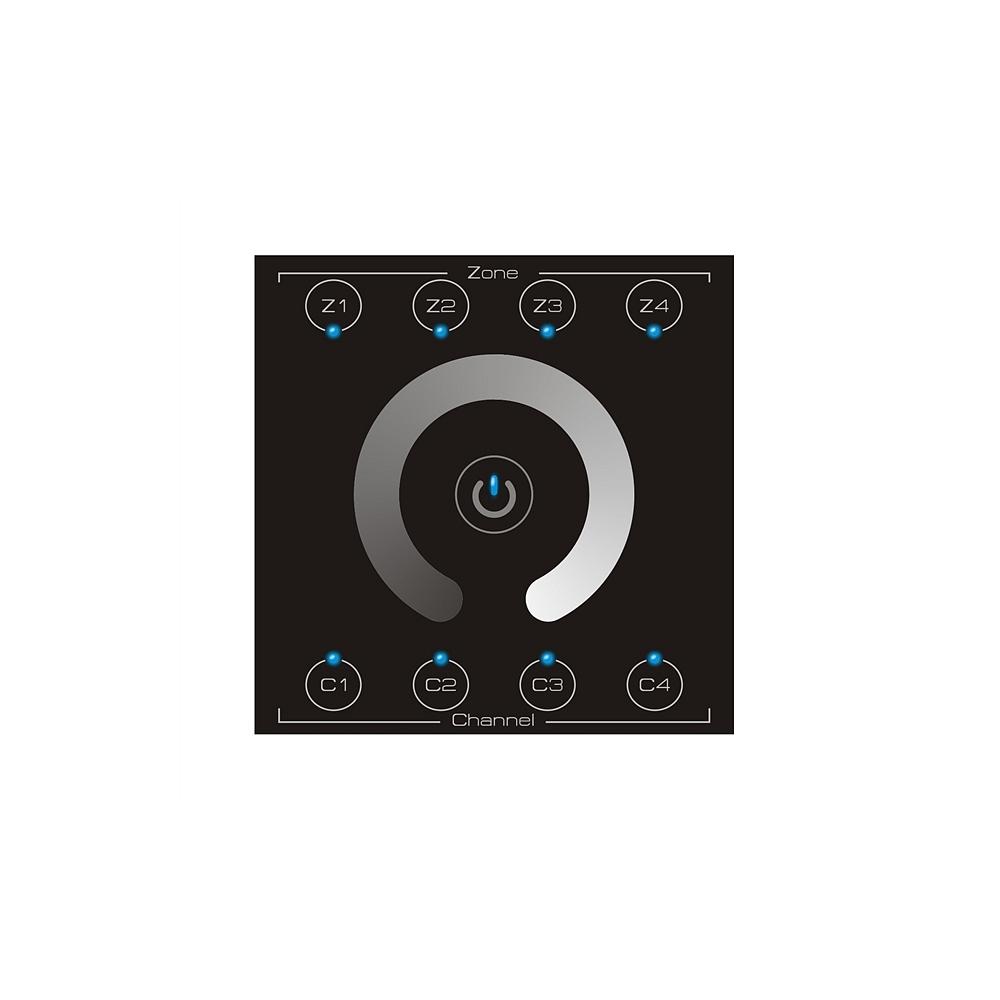The controller is black in color and made of glass and plastic. With a mounting opening of 6.8 cm in diameter, it can be easily integrated into various systems. The DMX Touch 16C has an IP protection rating of IP20 and can be used in a temperature range of 0°C to +40°C.